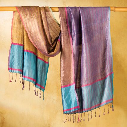 Three women's artist cooperatives in India share skills to create this whisper-light, yarn-dyed silk wrap. Following the paths of age-old textile traditions, silk farmers bring cocoons to the marketplace to sell to yarnmakers.