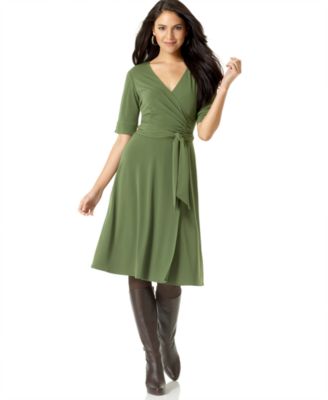 Donna Morgan Rachel tie-waist wrap-style dress features dry clean; imported; surplice v-neckline; scoop neckline at back; elbow-length sleeves; wrap-style bodice; tie at waist.